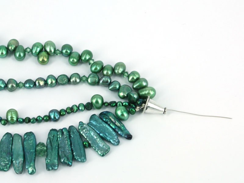 STEP 2. Thread each strand of the necklace on to jewellery wire and attach each strand to alternate loops with a crimp bead, using the Finishing With Crimps technique: DO NOT USE A WIRE GUARDIAN OR FRENCH WIRE/BULLION AS IT STOPS THE MESSY END FROM SLIDING RIGHT UP INSIDE THE CONE.